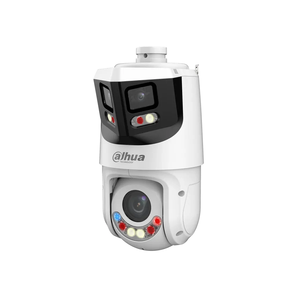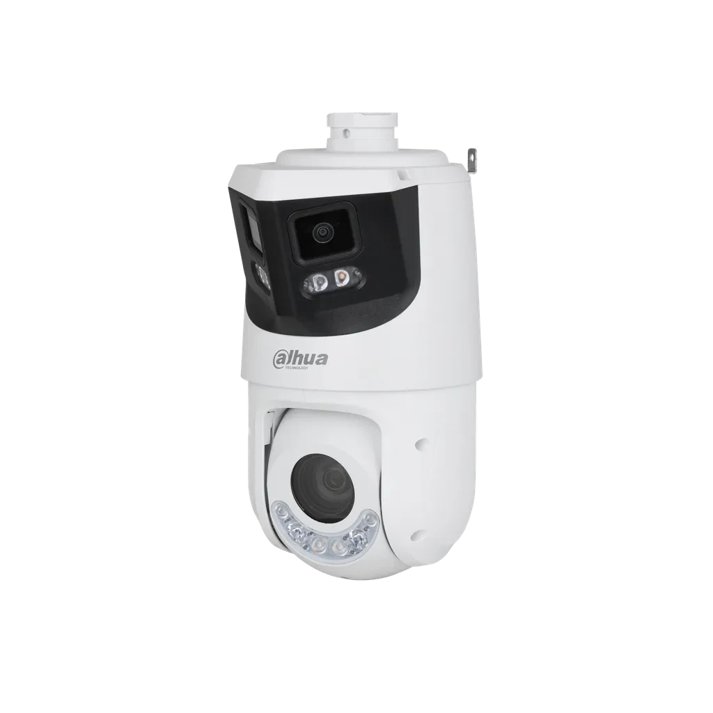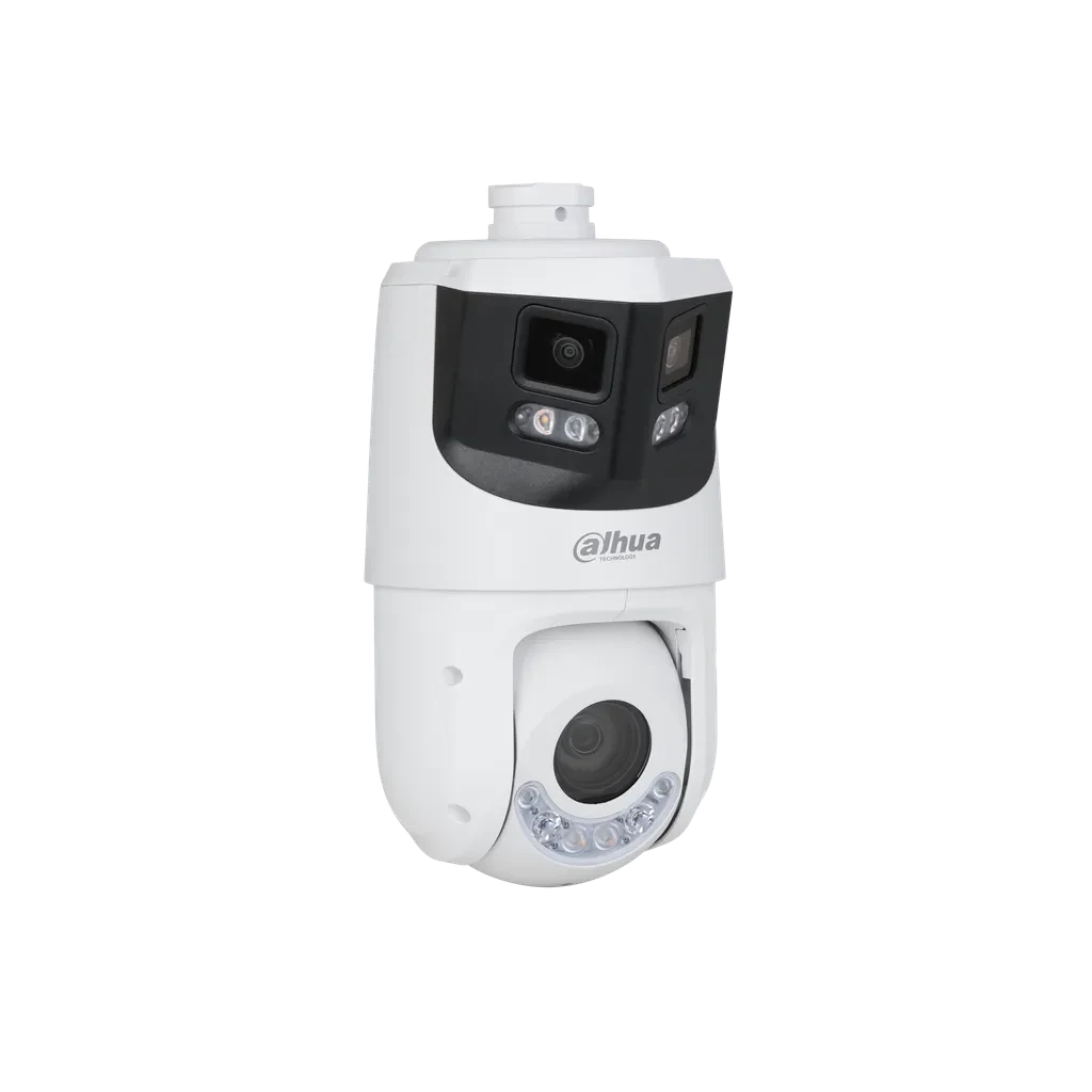 La cámara X-Spans de Dahua combina dos lentes en un solo dispositivo: una lente panorámica de 8MP para una visión de 180° y una lente PTZ de 4MP con zoom óptico 25x para detalles precisos.