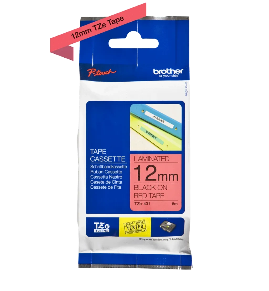 TZe431. Cinta BROTHER 12mm Negro en Fondo Rojo 8mt p/PT-H110/E300/E550/D600
