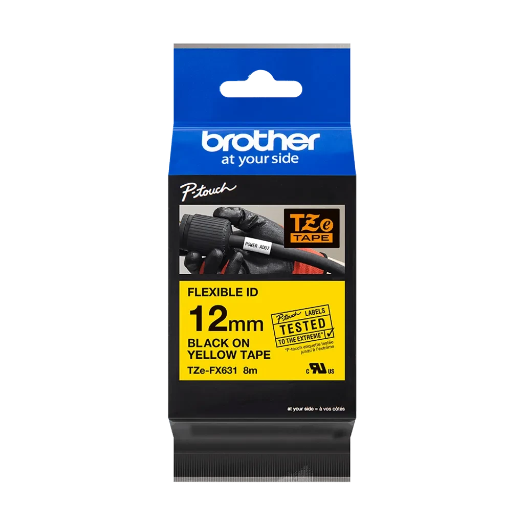 TZeFX631. Cinta BROTHER Flex 12mm Negro en Amarillo 8mt p/PT-H110 Extra-Flexible
