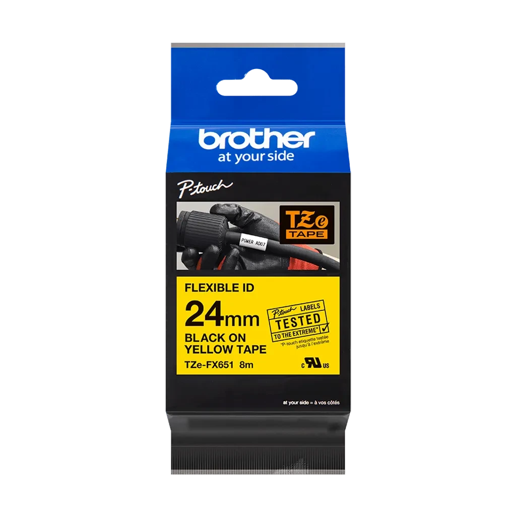 TZeFX651. Cinta BROTHER Flex 24mm Negro en Fondo Amarillo 8mt p/PT-E550WVP/D600V
